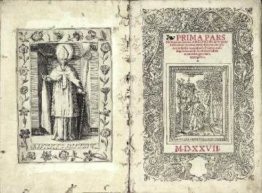 Titre en rouge et noir dans un joli encadrement sur bois de rinceaux et putti, avec une vignette au centre montrant saint