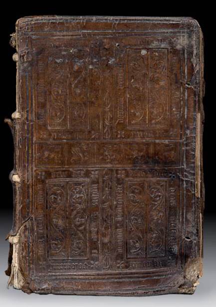 veau fauve estampé à froid, filets d'encadrement, décor des plats compartimenté en quatre cartouches verticaux