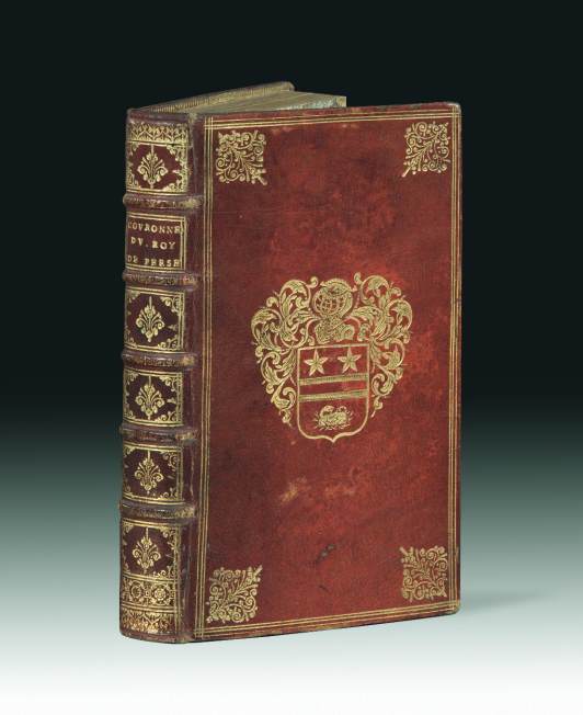 fleuron doré aux angles, armoiries au centre, dos orné, roulette intérieure, tranches dorées (