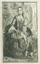 Fameux roman licencieux, paru en 1750, orné d'un frontispice gravé sur cuivre représentant Margot dans son tonneau.
