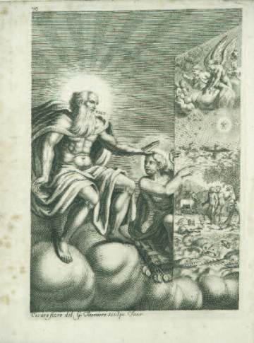L'une de ces planches retient particulièrement l'attention : Dieu y regarde sa Création au moment où il prononce sa