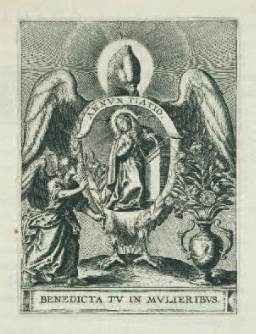 , représentant la Vierge Marie triomphant du Mal, de 2 vignettes identiques, de 42 gravures consacrées aux