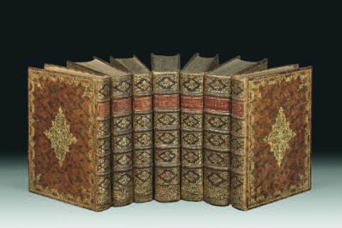 Ensemble 13 ouvrages en 7 volumes in-4, veau marbré, dentelle à motifs de végétaux autour des plats, au centre