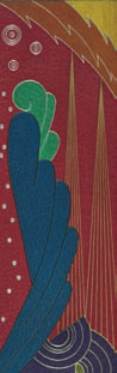 argent et points argent évoquant une silhouette sur un fond rouge qui figure