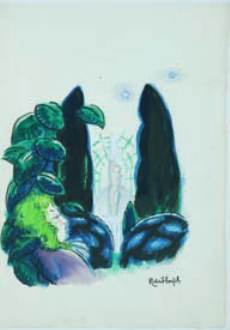 feuillage à froid, avec à son pied quatre buis taillés en topiaire mosaïqués de