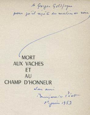 381. PERET Benjamin. MORT AUX VACHES ET AU CHAMP D’HONNEUR. Paris, Arcanes, 1953. In-8 broché.