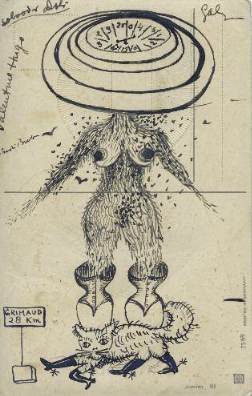 Cadavre exquis à l’encre réalisé au verso d’une carte postale représentant Saint-Paul.