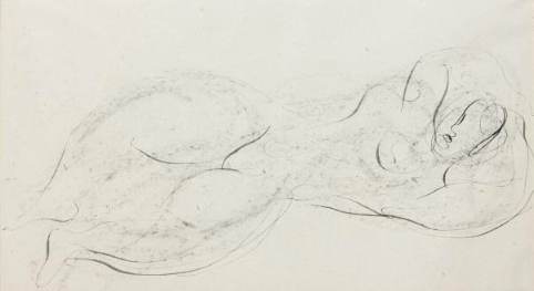 Dessin original à l’encre rehaussé au fusain par Fautrier représentant une femme nue allongée.