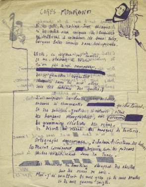 Poème autographe à l’encre mauve avec ratures et corrections et illustré dans les marges de 2 dessins à l’encre.