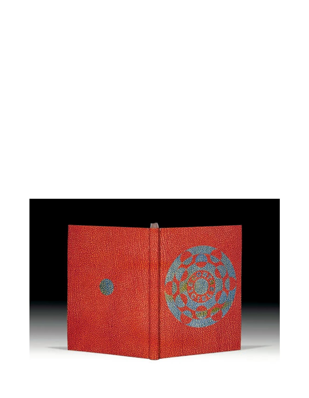 In-12, carré, box grainé rouge et verni, au centre du premier plat, décor aux rosaces de