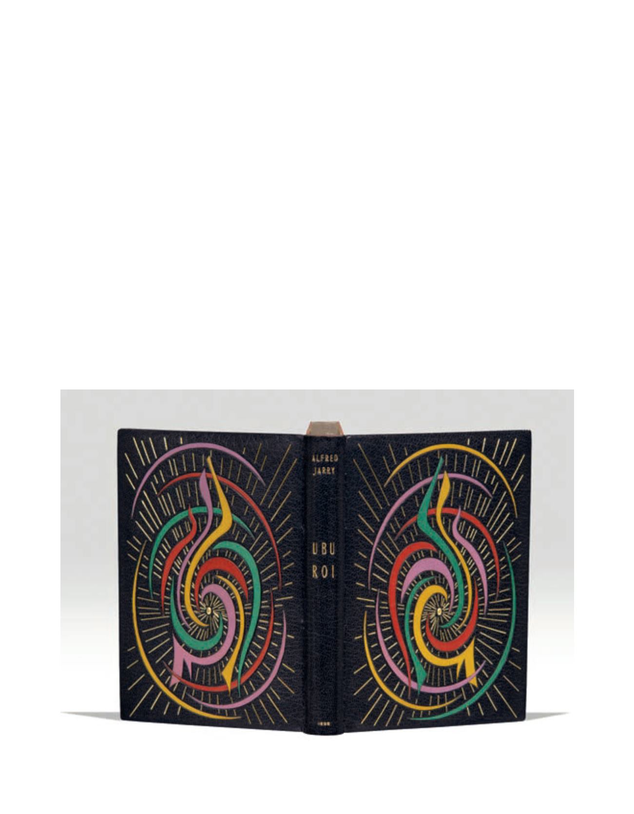 maroquin bleu corbeau, plats ornés de bandes étroites très contournées mosaïquées de box jaune,