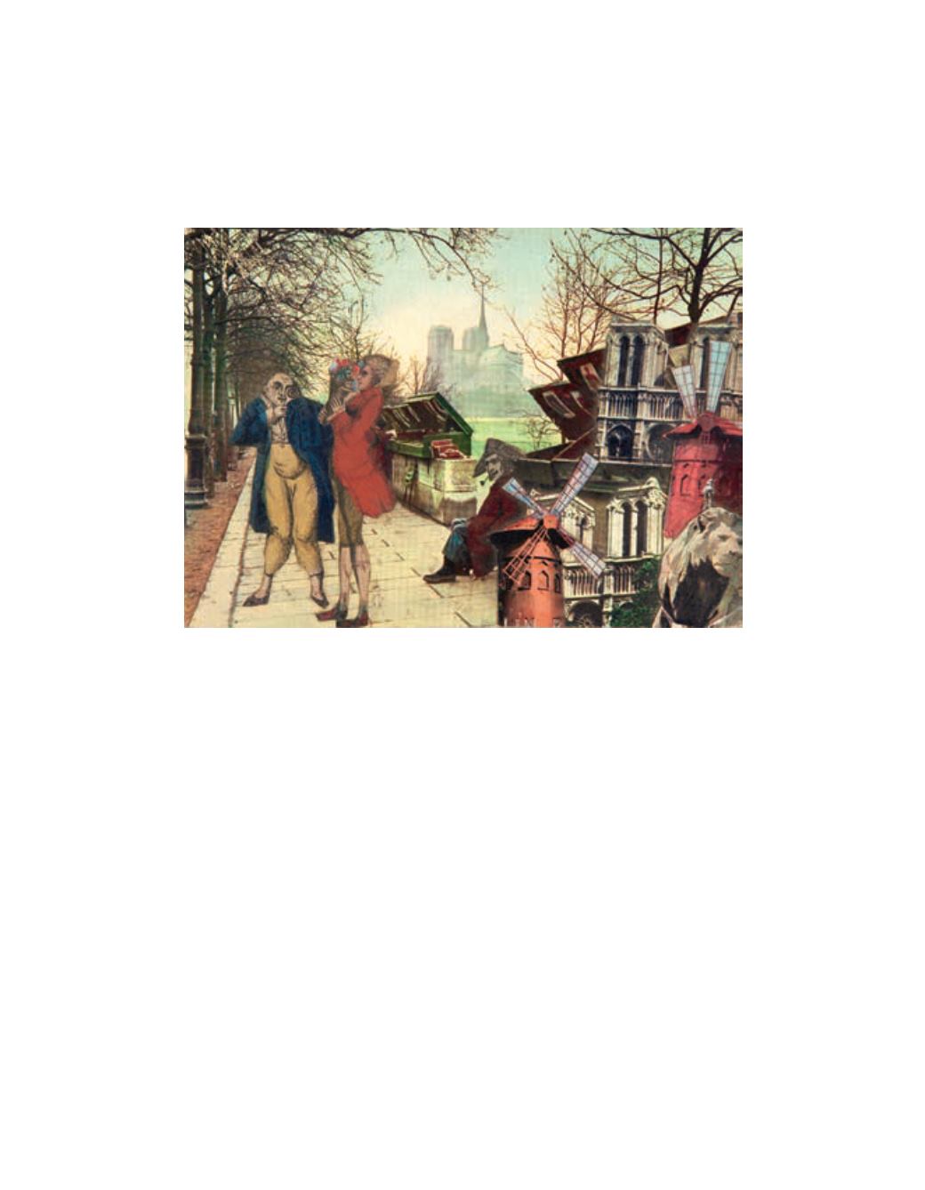 137. PRÉVERT (Jacques). Collage original sur une carte postale en couleurs : Paris – Les Bouquinistes