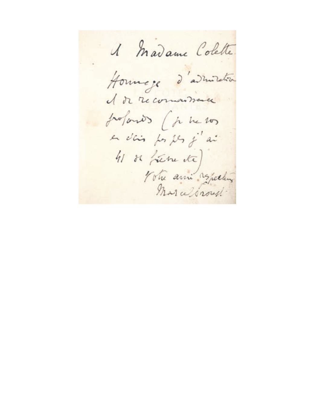 Proust avec inquiétude (que va-t’il penser de « Chéri » ?) et affection. Colette ».
