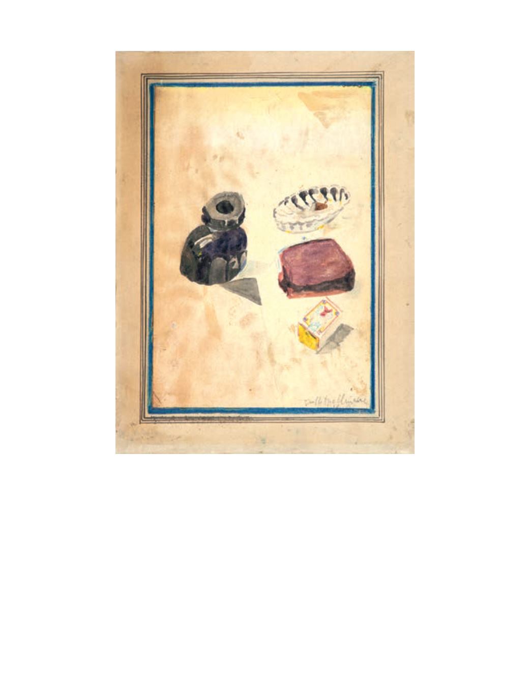 Sur cette aquarelle, où dominent le violet, le blanc et le noir, le poète a représenté en une nature morte, divers