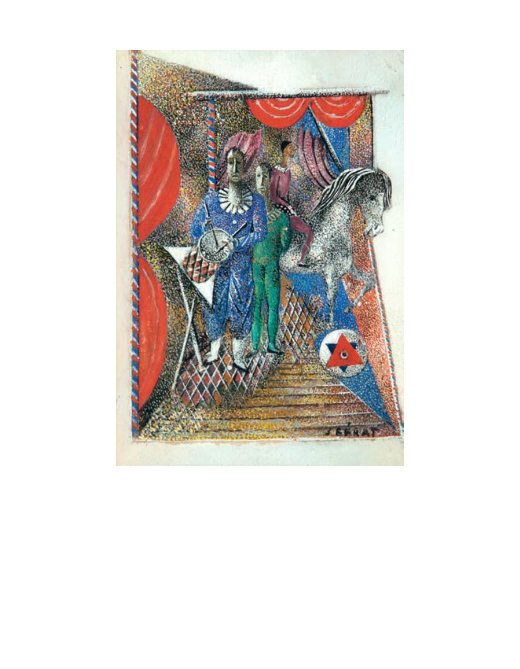 différences : elle représente un Arlequin jouant du tambour, deux clowns, dont l’un à cheval, sous un chapiteau.
