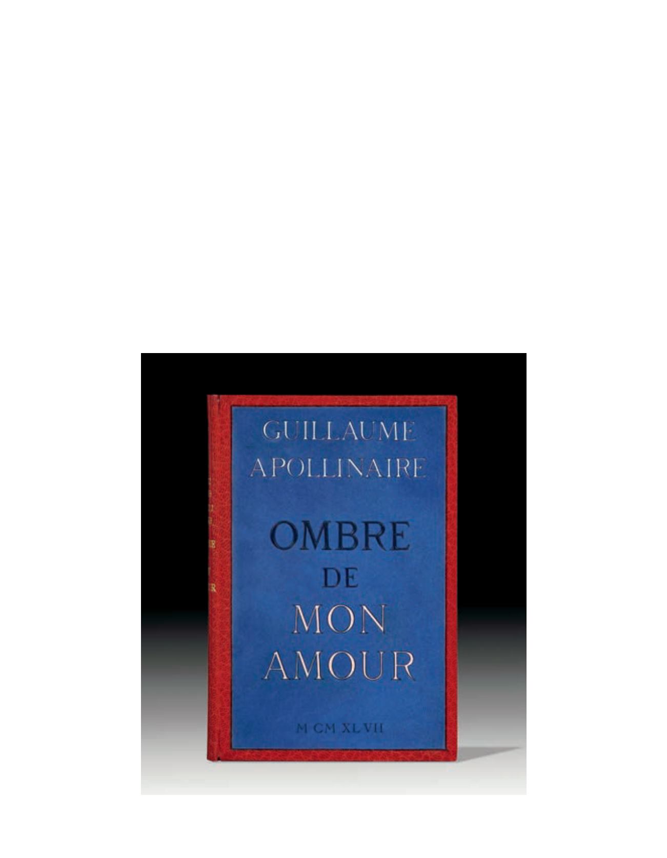 bords de maroquin rouge, plats de daim bleu horizon, titre central mosaïqué en lettres capitales de