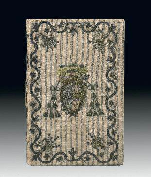 autour des plats, armoiries au centre brodées en soie de couleurs, dos lisse orné de cinq motifs, doublure et gardes