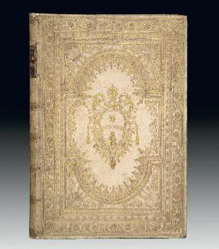 centre du premier plat, dos orné de filets et roulette dorés et de fleurons à froid, large dentelle droite sur