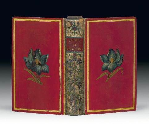 . In-12, plats laqués de rouge, encadrement de filets gras et maigre peints à l’or, au centre