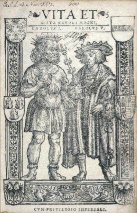 Le titre est orné d'un très beau bois encadré représentant Charlemagne et Charles Quint ; quatre grandes et jolies initiales