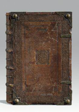 ciselés, restes de fermoirs en laiton ciselés, dos à nerfs orné de deux fers dorés accolés répétés, tranches bleues