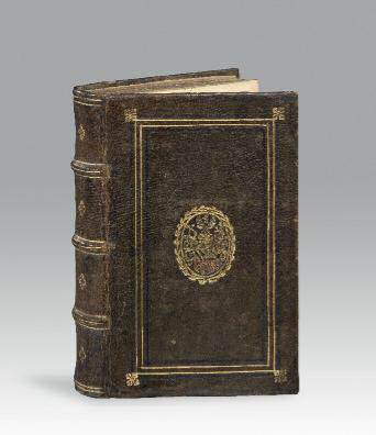 armoiries dorées au centre avec rehauts de peinture rouge, dos orné de filets dorés et d'un fer répété, tranches dorées