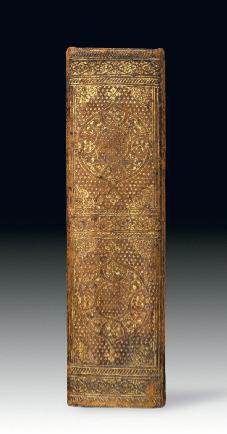 rinceaux couvrant le champ, dos lisse orné de deux panneaux se répétant l'un au-dessus de l'autre, décorés