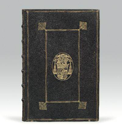 armoiries dorées au centre, dos orné, roulette intérieure, tranches dorées (