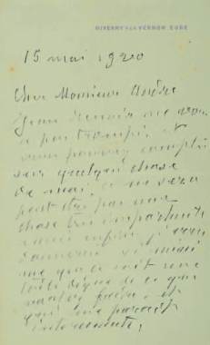 15 mai 1920 ; 3 pages 1/4 in-8°. En-tête à son adresse à Giverny.