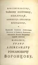 Vol. I (1783) : 1 pp, ft, titre, envoi (Imp.) à A.Vorontzov, table, 44 pp préface, 216 pp (du 49 à 364), 1 ff.