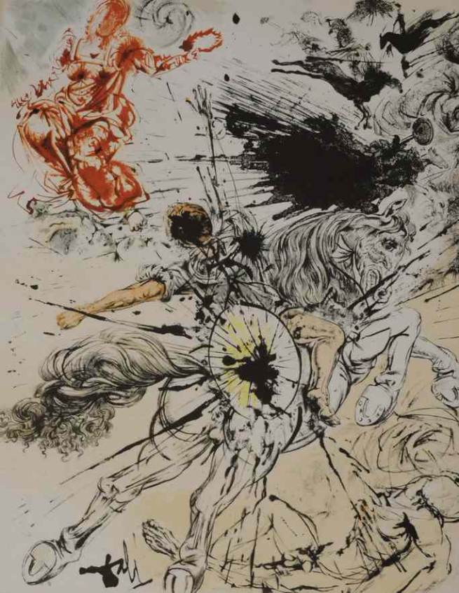 Quichotte] est née d'une ampoule électrique remplie d'encre lithographique que Dali a laissée tomber. Les traces de pattes de