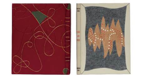 pièce irrégulière de peau retournée chamois ponctuée de pastilles rouges et blanches, dos lisse, tête dorée, couverture et dos, étui (Reliure