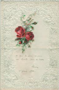 Sous la chromolithographie d’un bouquet de roses et de muguet, Renoir a collé une petite vignette en forme de cœur portant les mots :