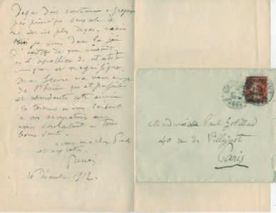 16 décembre 1912, à Mlle Paule Gobillard ; 2 pages in-8 à son adresse, enveloppe.