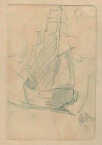 Sur une page de carnet, croquis d’un voilier, avec un petit bateau à voile dans