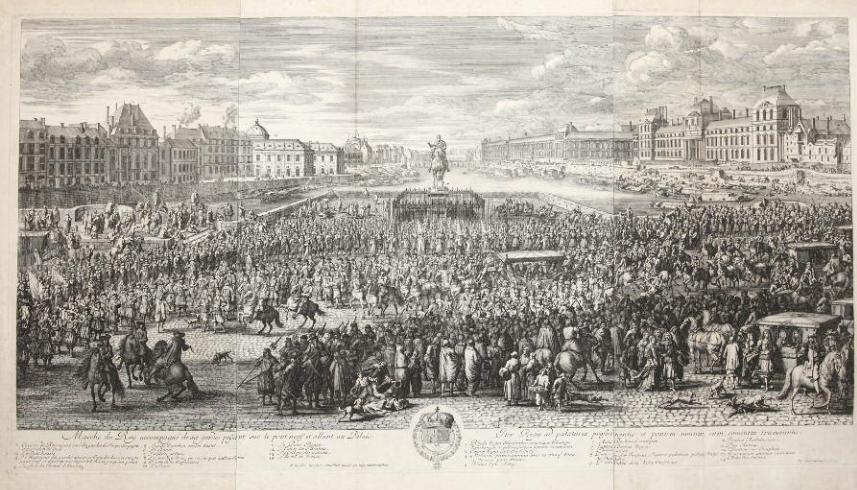 Gravé par I.V.Huchtenburgh. (Hollstein 48). 52 x 97 cm. Eau - forte. Très belle épreuve sur trois feuillets raboûtés,