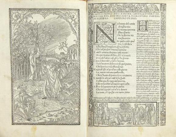 Landino. Jolie marque de Stagnino sur le titre qui est orné d’une bordure et d'une scène du paradis terrestre, FRONTISPICE ET 98
