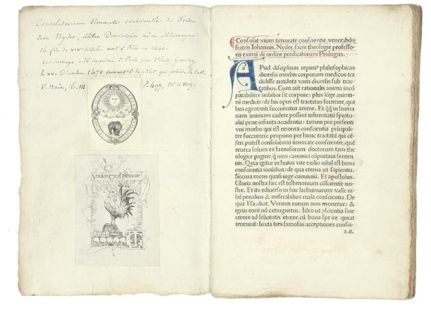 Ex-libris manuscrit sur la garde : « Non mei fiducia sed ejus » (Il n'a pas confiance en lui-même mais fait confiance au livre ?).
