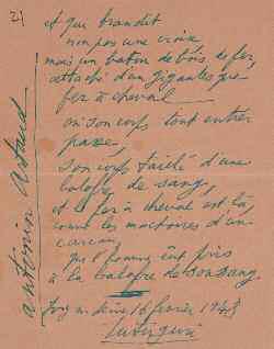 Ce manuscrit autographe complet de « Tutuguri » signé par Antonin Artaud a été adressé à Marc Barbezat, éditeur de l’Arbalète, dans une lettre datée du 16 février 1948.