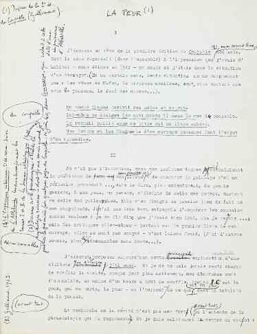 Ce document préparatoire comporte des références éditoriales en notes et des indications destinées à l’impression. « La Peur » a été publié pour la première fois dans le numéro 95 de novembre 1960 de La Nouvelle Revue Française. Ce texte était dès l’origine destiné à constituer la préface d’une réédition du « Coupable », et fut intégré au tome II de « La Somme athéologique ».