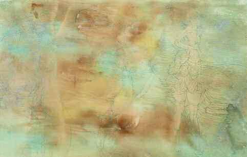 Encre de couleur, gouache et décalcomanie sur papier représentant 5 personnages féminins dont le personnage central pourrait être Unica Zürn, compagne de Bellmer.