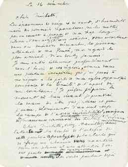 […] « On commence à distinguer la tête de mort au bout du précipice ! Noble pays aux ressources de Ful-minate et d’eau bénite. Narines tirées. Voila mon Cher Pierre, la houille blanche que les bouillons de ces 20 dernières années préparaient dans les gaves. Lumière ? Lumière ! Les salauds partout ? » […] La seconde et superbe lettre adressée à Michette, femme de Pierre Mabille, comporte des ratures et corrections, dans laquelle il donne également les coordonnées précises du 173 e R.A.L.G.P.A. […] « Je préfère préparer le moment où bien vivant, je prendrai la main des êtres que j’estime et que j’aime, détruisant d’un seul coup la rampe de l’atroce invisibilité, moignon de la mauvaise conscience des autres derrière laquelle je suis exilé. Confiance… La clarté qui se fraye un chemin vers nos artères dans un silence et une attention d’or est proche du rendez-vous. Son verbe partout déjà murmure »