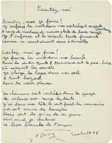 N OS MERS . Poème autographe en prose à l’encre noire daté 8 avril 1946 ; 1 page ½ in-8° de cahier d’écolier. Inédit. S ILENCE . Poème autographe signé, daté juin 1946 de 11 vers en 2 strophes, 1 page in-8°.