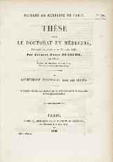 In-4° broché sous couverture d’attente moderne, 60 pages. Thèse soutenue à Paris le 25 août 1848. Rarissime thèse de médecine du célèbre docteur Blanche qui dans sa clinique de Passy, fondée par son père Esprit, et que l’on n’appellera bientôt plus que la Clinique du Docteur Blanche, soigna Maupassant, Gérard de Nerval, Rossini ou la comtesse de Castiglione. Il s’agit bien de l’exemplaire de thèse de la Faculté de Mé-decine de Paris.