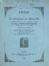 Très grand in-8° broché sous couverture d’attente de papier mar-bré, 39 pages ; thèse soutenue à Paris le 1 er décembre 1856 ; bel et long ENVOI AUTOGRAPHE de l’auteur à Scipion Pinel, le fils ainé de Philippe Pinel, illustre aliéniste de l’époque sur le plat de couverture (les deux plats de couverture bleus sont conservés). Il s’agit bien de l’impression de thèse de la Faculté de Médecine de Paris.