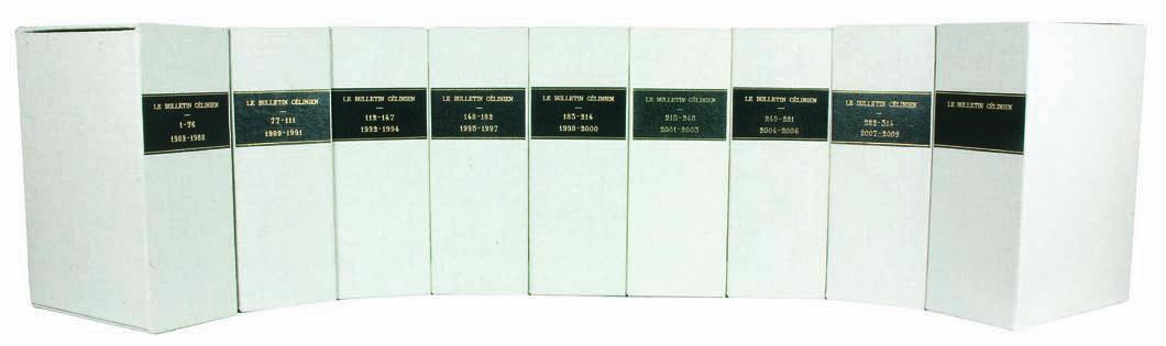 Du n°0 de 1981 au n°330 de mai 2011. Le tout présenté dans 9 boîtes pleine toile écru avec pièces de titre sur cuir noir (reliure signée Laurenchet). Impressionnant travail de ce sympathique belge qui est devenu au fil des ans le spécialiste incontesté de Céline, regroupant autour de sa revue tout ce que compte le monde