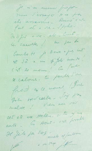 1950 à une personne non identifiée et signée LF et Lucette. Deux pages in-4. Virulente lettre où il attaque son ami, Gégenne ( Gen Paul) ; « C’est une âme pourrie et malfai-sante. Un sale cloporte fort amusant certes, mais horrible-ment dangereux à fréquenter… de basse jalousie contre les faibles, jamais contre les forts » . Puis il parle de lui, « je n’ai aucun projet, sinon essayer de ne pas être assassiné, ruiné c’est fait à vie, indigné à vie ! » . 700/800