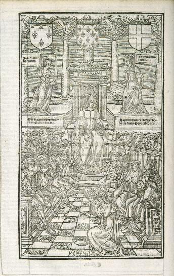 Joli titre en rouge et noir, dans un grand encadrement architectural de Galliot du Pré, avec au verso l'écu de France. Grand bois à pleine page représentant l'auteur offrant son livre à Louise de Savoie, mère de François I er , et d’un bois dans le texte montrant les Troyens édifiant la ville d'Angers.