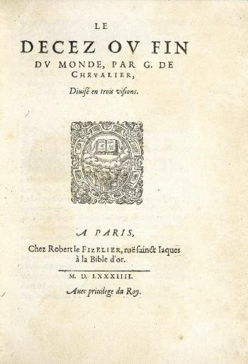 « Previous Page Table of Contents Next Page »49 CHEVALIER (Guillaume de). Le Decez ou fin du monde. Divisé en trois visions. Paris, Robert le Fizelier, 1584.