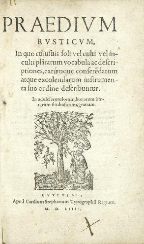 - De re hortensi libellus, vulgaria herbarum, florum, ac fructicum ... Paris, Robert Estienne, 1539. Pritzel, 2745 (pour l'édition originale). – Renouard, p. 48. Nouvelle édition de cet ouvrage, dont l'originale fut publiée en 1535.